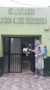 En la oportunidad recorrieron el edificio de la Escuela Florentino Ameghino, una de las más históricas de la ciudad. Allí recorrieron aulas y oficinas para desinfectar todos los rincones de la escuela.
